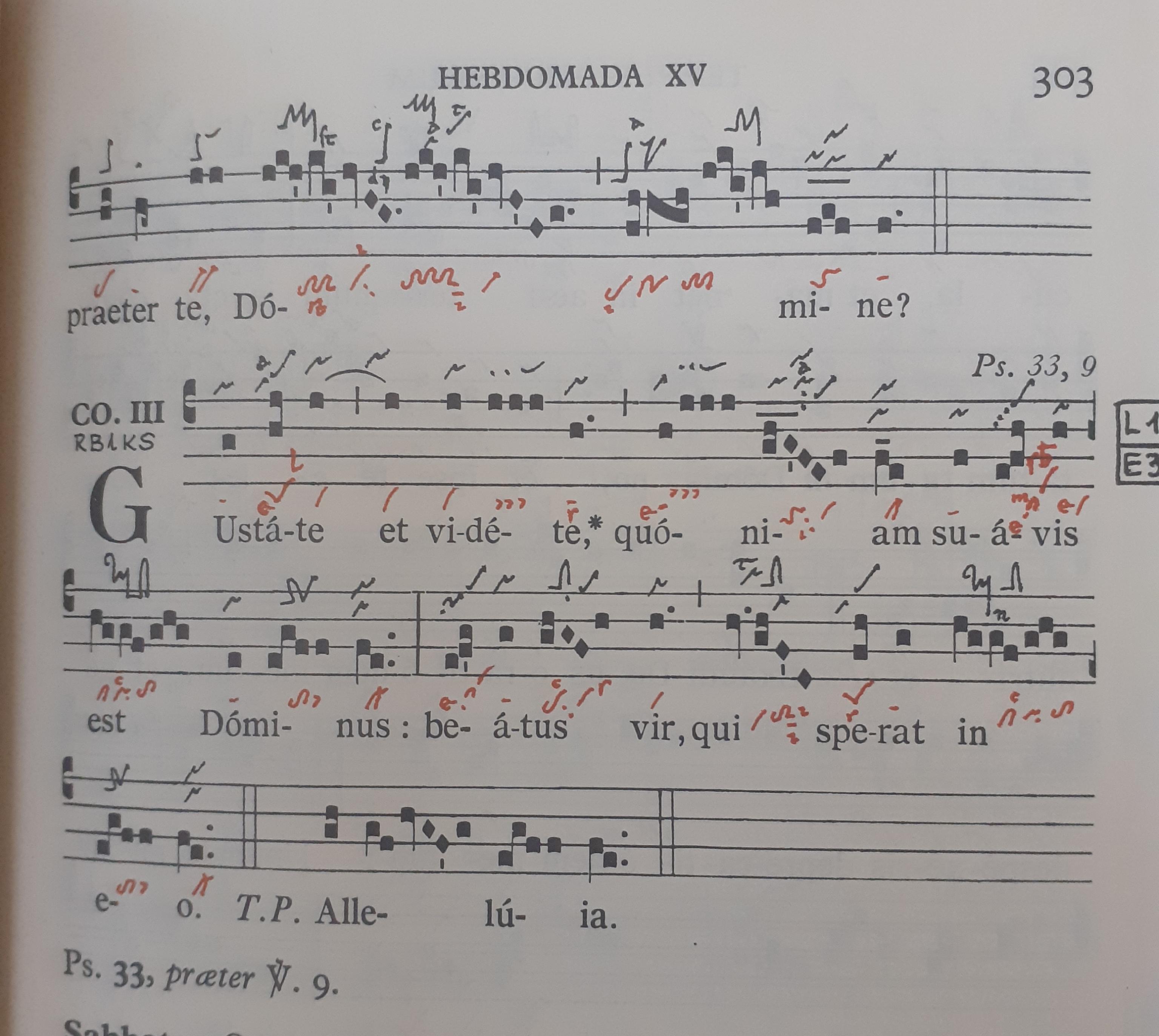 Hopefully, this example shows how the “song of Christ” in the Graduale Romanum has been transmitted so we can sing the Mass today in communion with all the saints who sang the same melodies throughout the centuries. “Gustate et Videte” will be sung this coming Sunday in the Traditional Latin Mass.