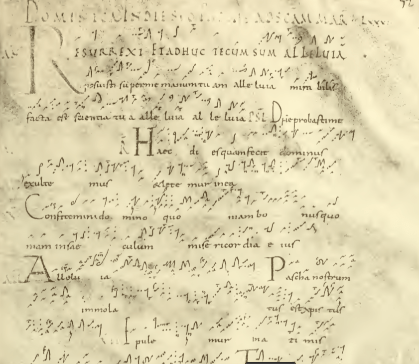 This “song of Christ” was not written down as music on paper for centuries, but lived as an oral tradition in the liturgy of the early Church. The oldest records of the music of the mass notated are from the 9th and 10th century, and they look like this: