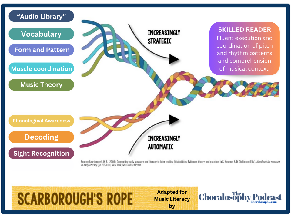 In a recent post, I shared how Chris Munce of the Choralosophy podcast adapted the Scarborough’s rope modelization of teaching reading, to music literacy. Please refer to the post for a detailed explanation of Scarborough’s rope.