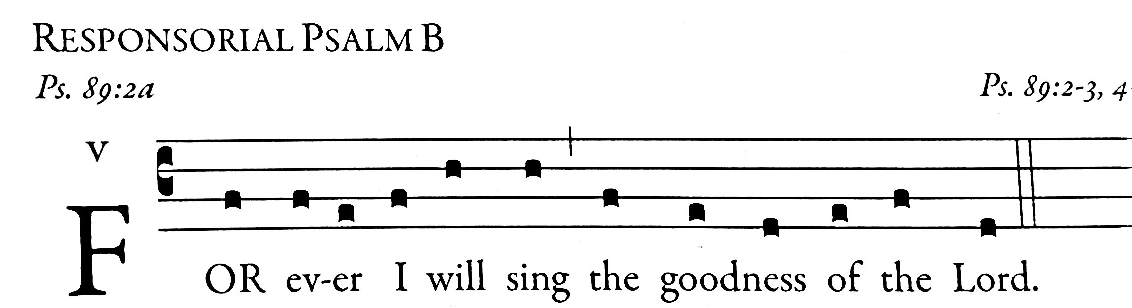 Simple English Proper (Lumen Christi Gradual and Modal Responsorial Psalms). The Roman Missal gives us these Bible verses to be sung per the examples recorded: the congregation joins the cantor for the antiphon (printed), then the cantor sing the Psalm alone, then the congregation and cantor repeat the antiphon.