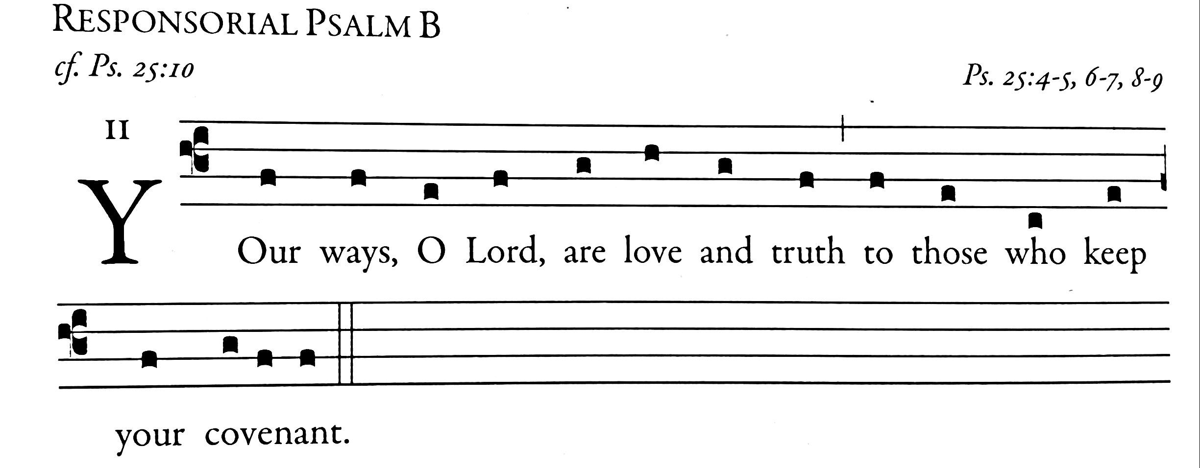 Simple English Proper (Lumen Christi Gradual and Modal Responsorial Psalms). The Roman Missal gives us these Bible verses to be sung per the examples recorded: the congregation joins the cantor for the antiphon (printed), then the cantor sing the Psalm alone, then the congregation and cantor repeat the antiphon.