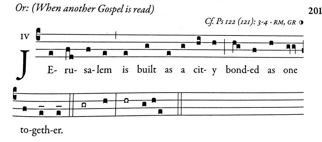 Simple English Proper (Lumen Christi Gradual and Modal Responsorial Psalms). The Roman Missal gives us these Bible verses to be sung per the examples recorded: the congregation joins the cantor for the antiphon (printed), then the cantor sing the Psalm alone, then the congregation and cantor repeat the antiphon.