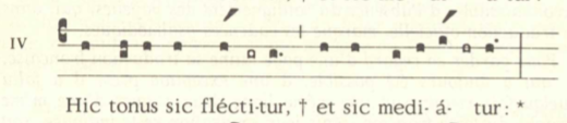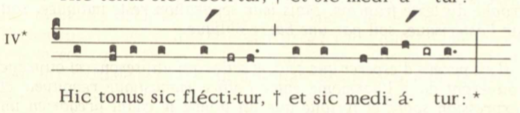 Introit and Communion verses are build around a RECITATION tone, an INTONATION (repeated with a light variation), a MEDIATION, and a TERMINATION (ignore the “Flex” for now):