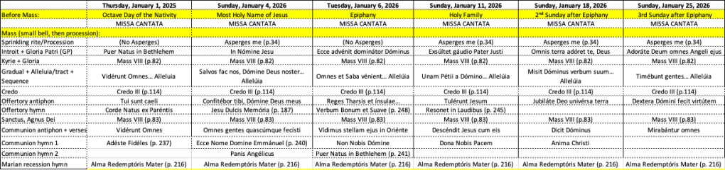 Thursday, January 8 (5:00-6:30pm) – Music for January 11 & 18; Fr. Victor’s Ave Verum
