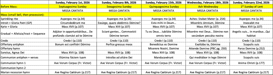 Tuesday, February 17 (5:00-6:30pm) – Propers for February 18 & 22 and March 1; Elgar’s Ave Verum; and Scapulis Suis