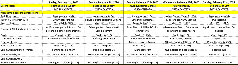 Tuesday, February 3 (5:00-6:30pm) – Propers for February 8 & 15; Fr. Victor’s Ave Verum; and Scapulis Suis