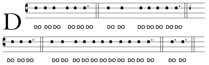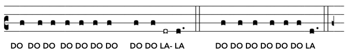 Notice how only 6 notes are used (Re, Mi, Fa, Sol, La and Te). Most of the intervals are between notes that follow each other in the scale (ex: re-mi, or mi-fa,…) but most sentenced include a “jump” in the scale, an interval called a “third”. It can be either a minor third (re-fa, fa-re, mi-sol or sol-mi) or a major third (fa-la, or la-fa). The melody also contains only three “Perfect fifths”(always Re-La) and only two “Perfect fourth” (both are sol-re).