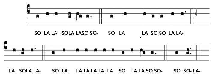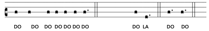 Notice how only 6 notes are used (Re, Mi, Fa, Sol, La and Te). Most of the intervals are between notes that follow each other in the scale (ex: re-mi, or mi-fa,…) but most sentenced include a “jump” in the scale, an interval called a “third”. It can be either a minor third (re-fa, fa-re, mi-sol or sol-mi) or a major third (fa-la, or la-fa). The melody also contains only three “Perfect fifths”(always Re-La) and only two “Perfect fourth” (both are sol-re).
